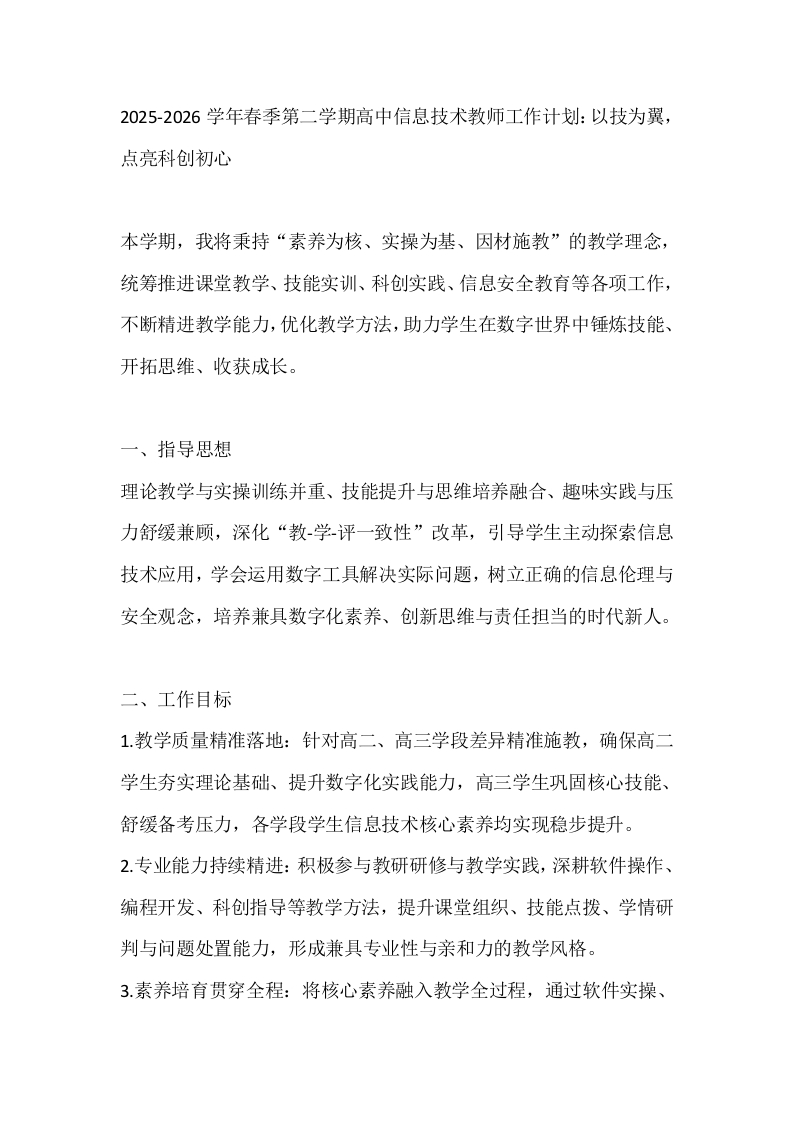 2025-2026学年春季第二学期高中信息技术教师工作计划:以技为翼,点亮科创初心
