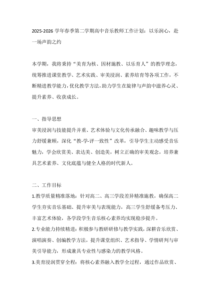 2025-2026学年春季第二学期高中音乐教师工作计划:以乐润心,赴一场声韵之约