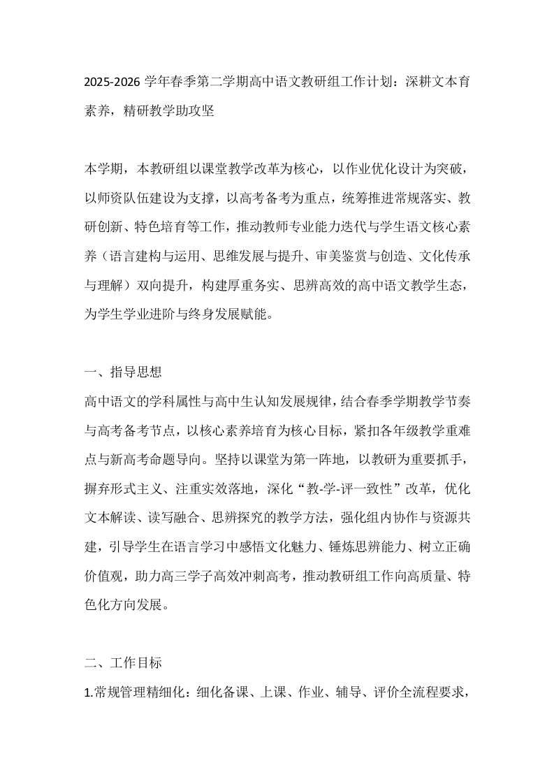 2025-2026学年春季第二学期高中语文教研组工作计划:深耕文本育素养,精研教学助攻坚