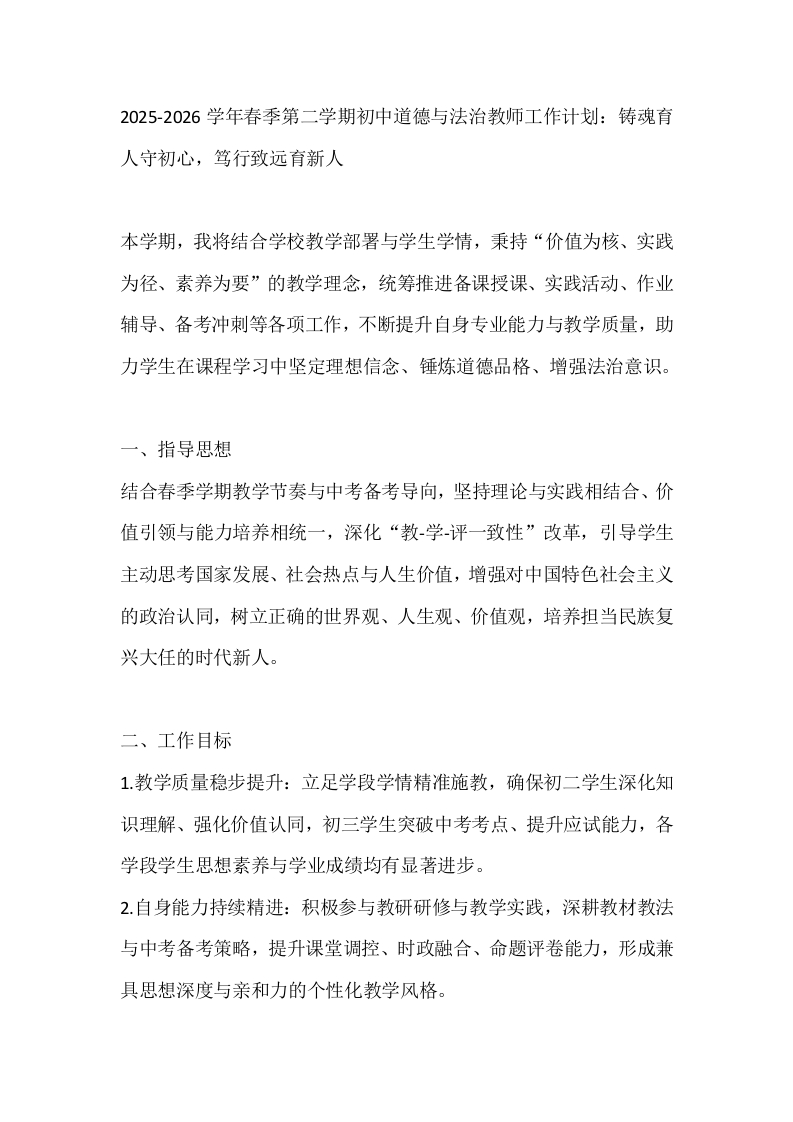 2025-2026学年春季第二学期初中道德与法治教师工作计划:铸魂育人守初心,笃行致远育新人