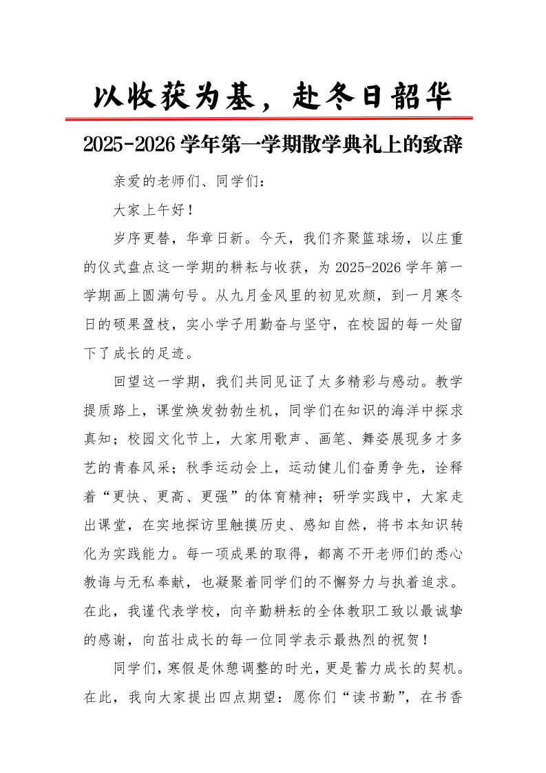 2025-2026学年第一学期散学典礼上的致辞:以收获为基,赴冬日韶华