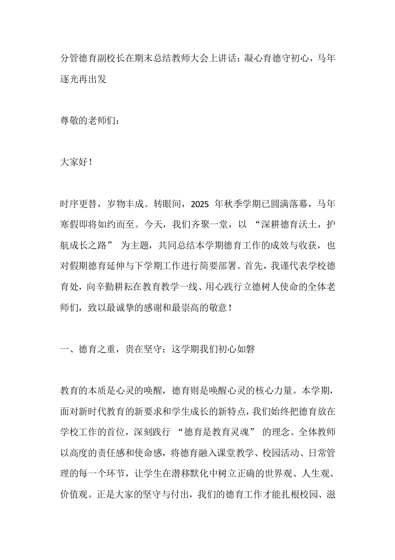 分管德育副校长在期末总结教师大会上讲话:凝心育德守初心,马年逐光再出发