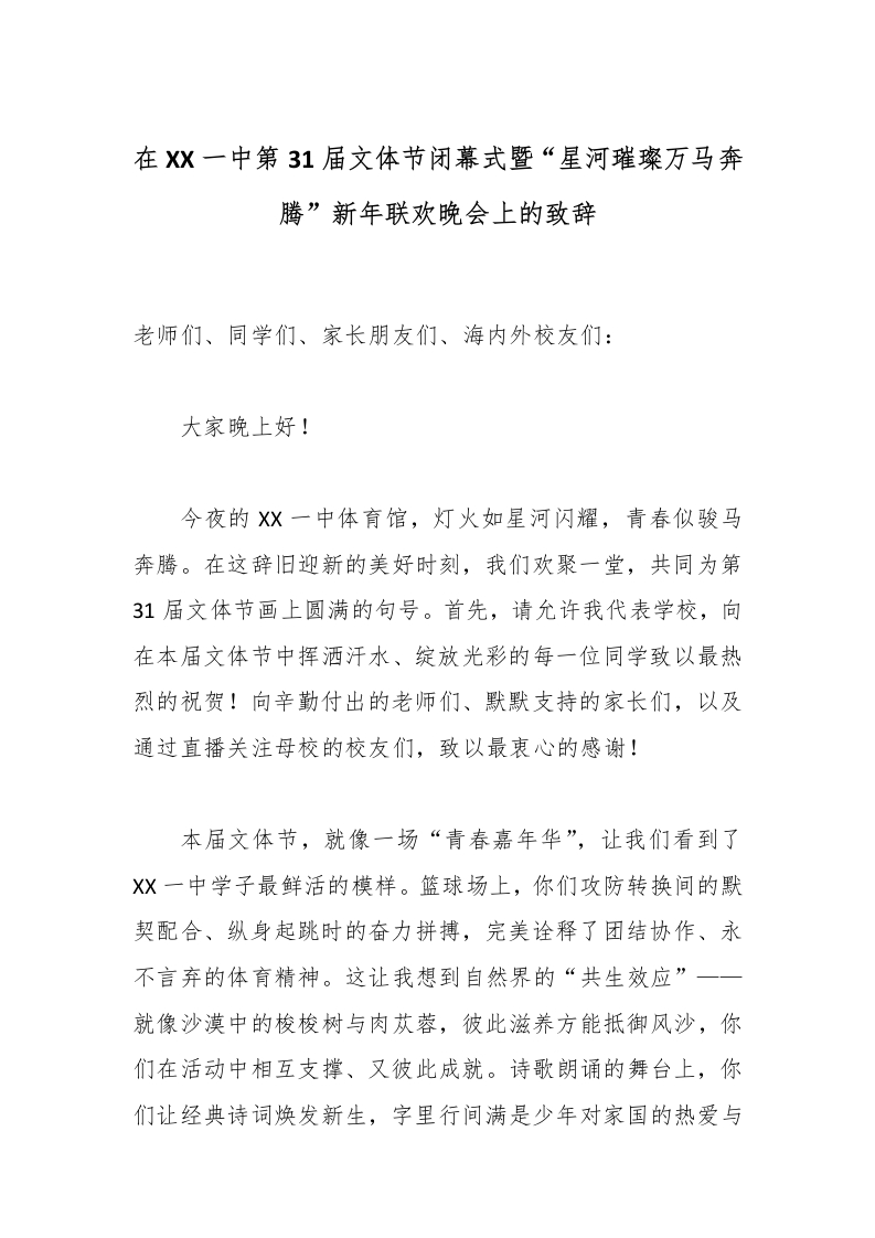 在XX一中第31届文体节闭幕式暨“星河璀璨万马奔腾”新年联欢晚会上的致辞