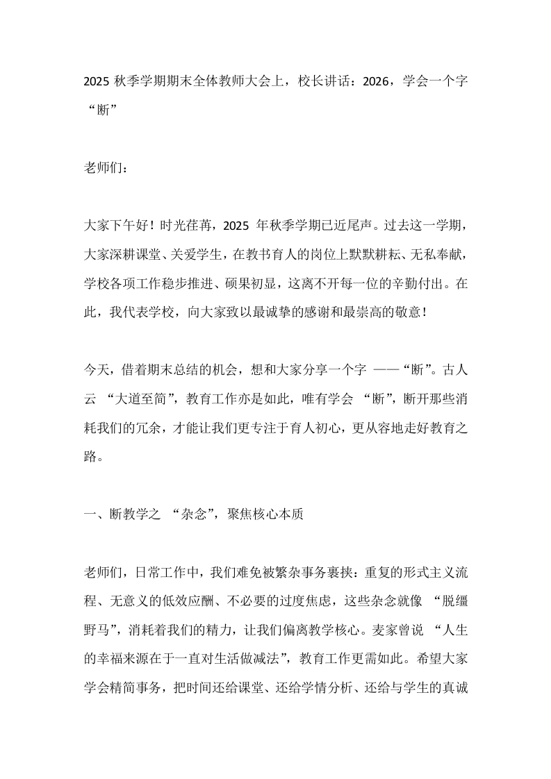 2025秋季学期期末全体教师大会上,校长讲话:2026,学会一个字“断”