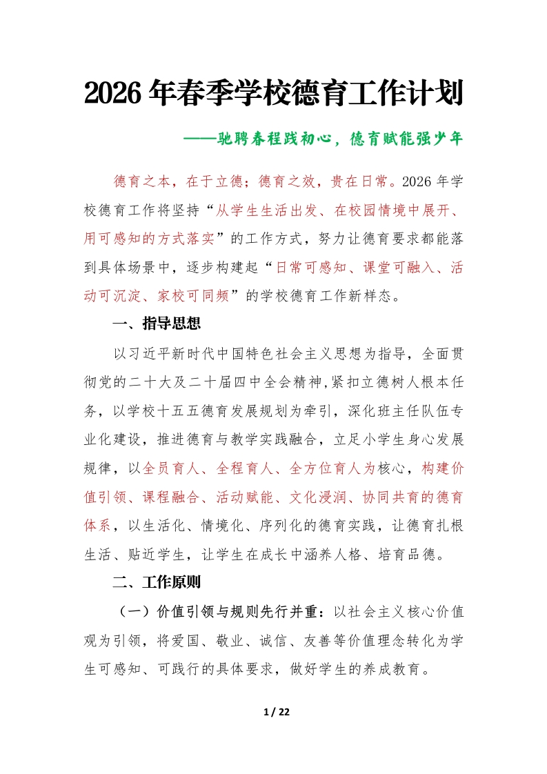 2026年春季第二学期学校德育工作计划及安排表:驰聘春程践初心,德育赋能强少年