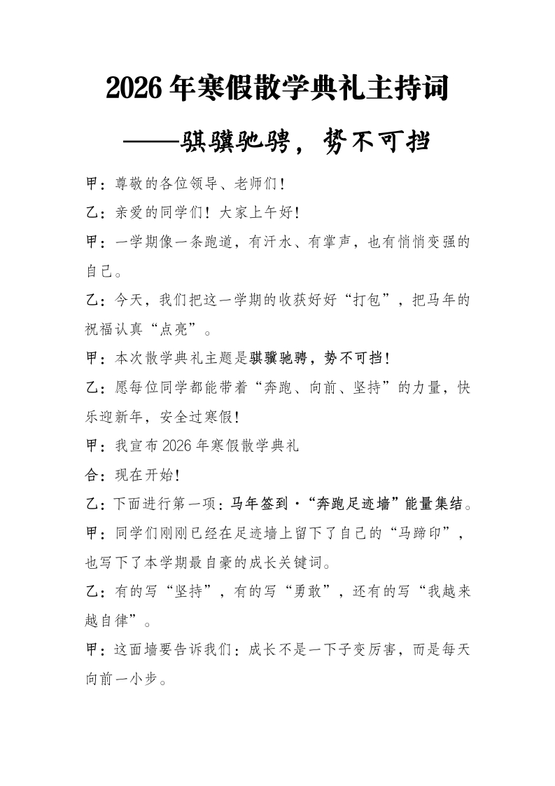 2026年寒假散学典礼主持词——骐骥驰骋,势不可挡