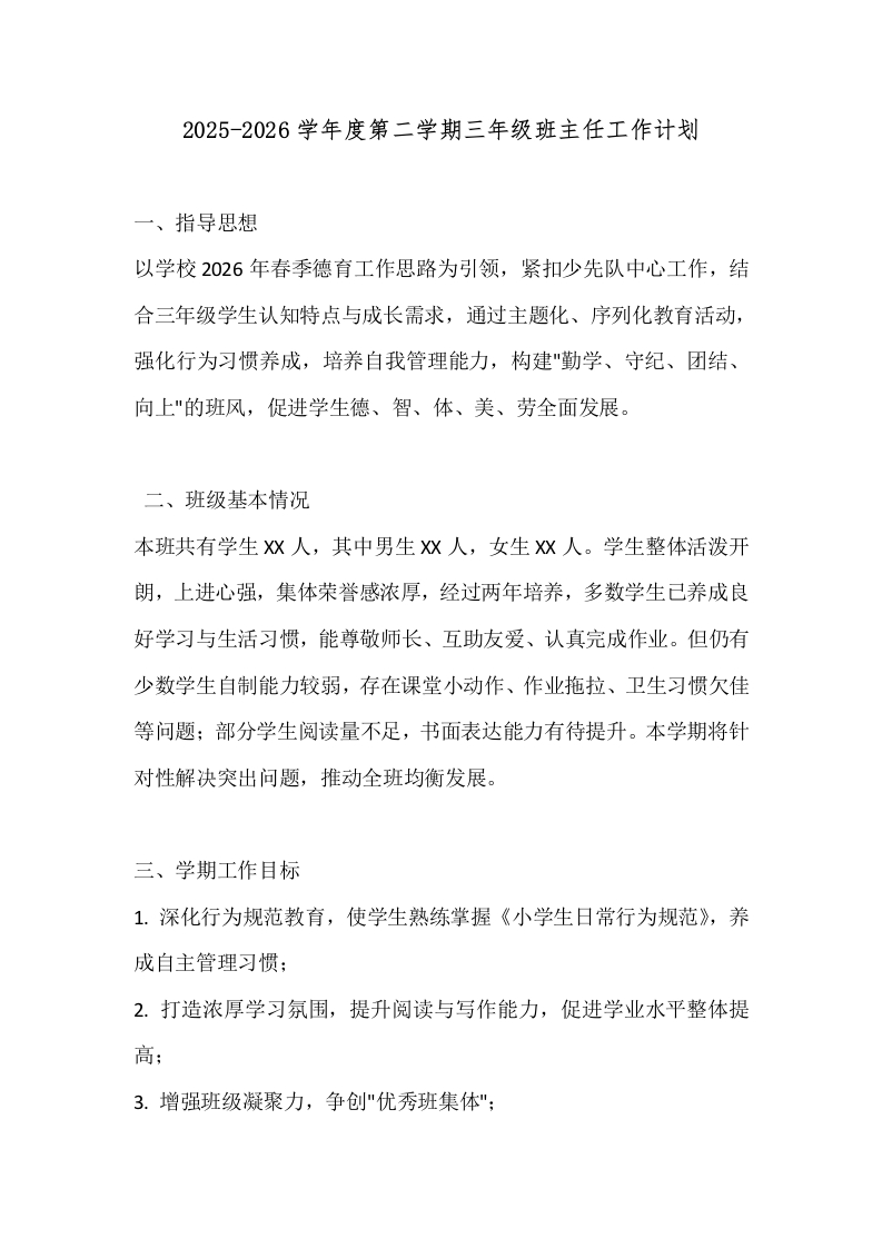 2025-2026学年度第二学期三年级班主任工作计划
