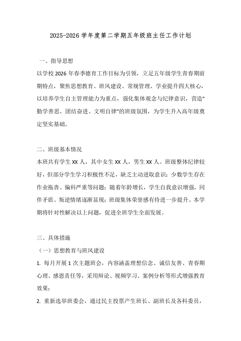 2025-2026学年度第二学期五年级班主任工作计划