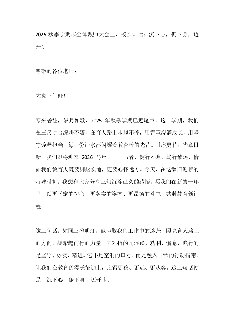 首页校长资料工作讲话2025秋季学期末全体教师大会上,校长讲话:沉下心,俯下身,迈开步