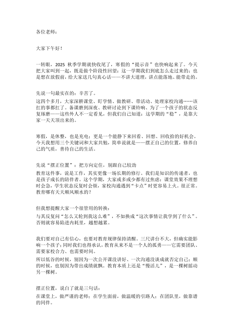 2025秋季学期期末寒假离校前,校长在全体教师大会上讲话​: 摆正自己,修养自己,善待自己