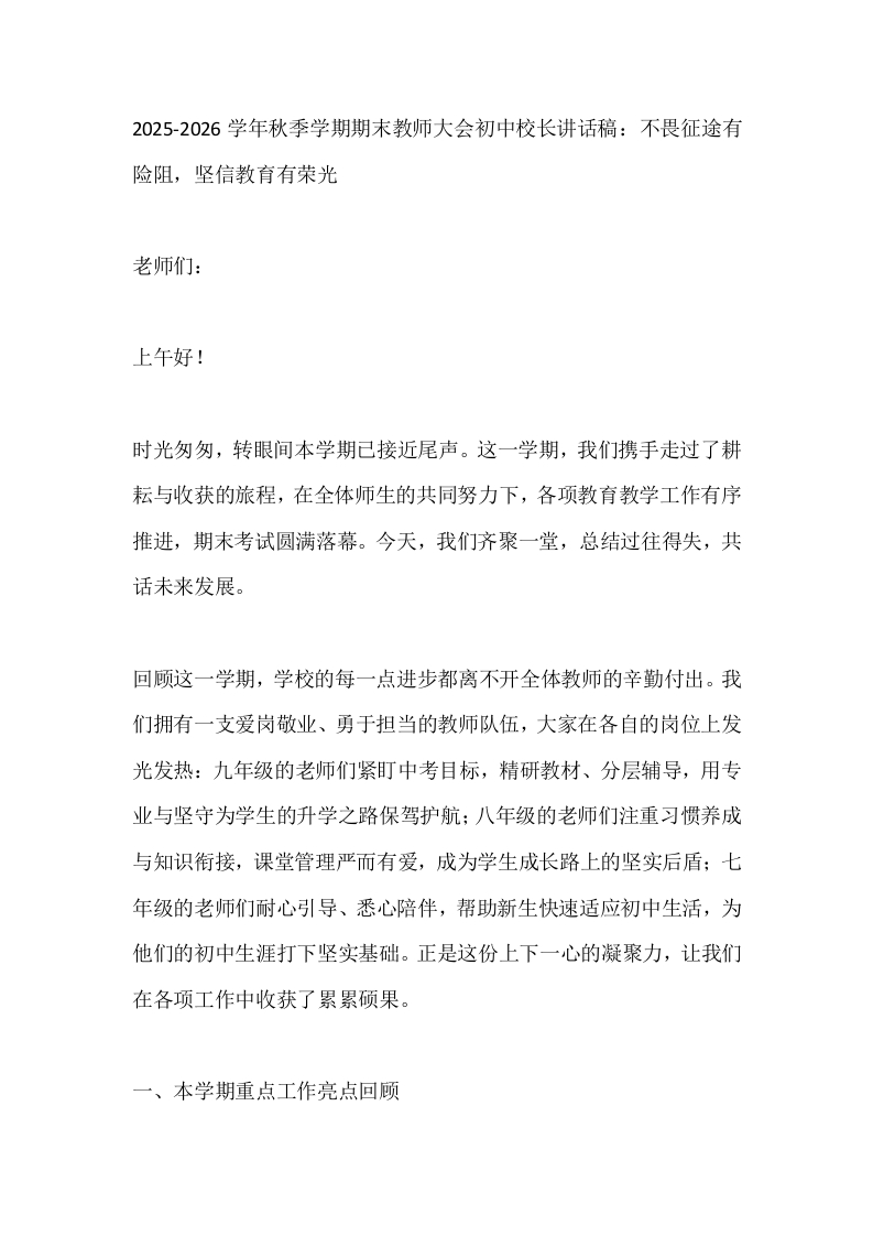 2025-2026学年秋季学期期末教师大会初中校长讲话稿:不畏征途有险阻,坚信教育有荣光