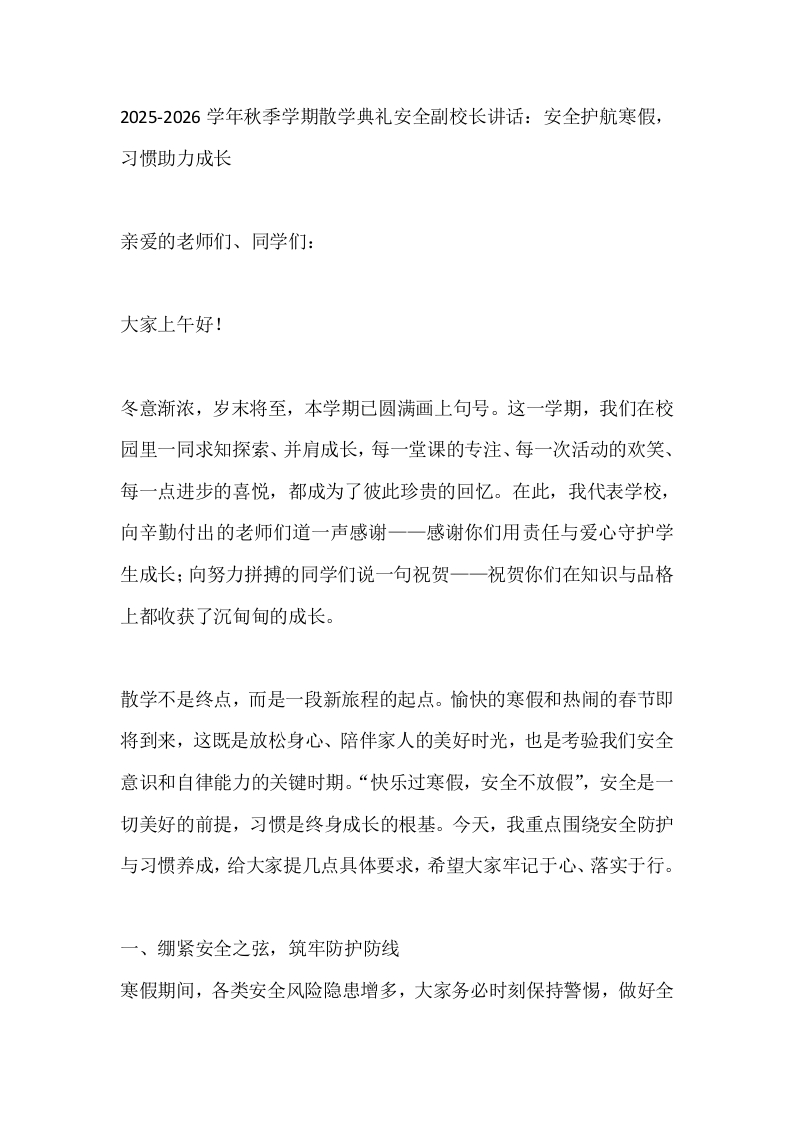 2025-2026学年秋季学期散学典礼安全副校长讲话:安全护航寒假,习惯助力成长