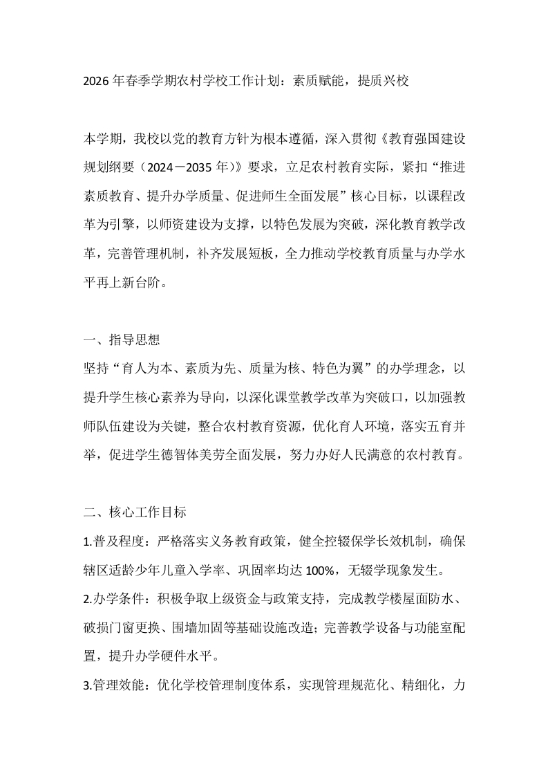2026年春季学期农村学校工作计划:素质赋能,提质兴校