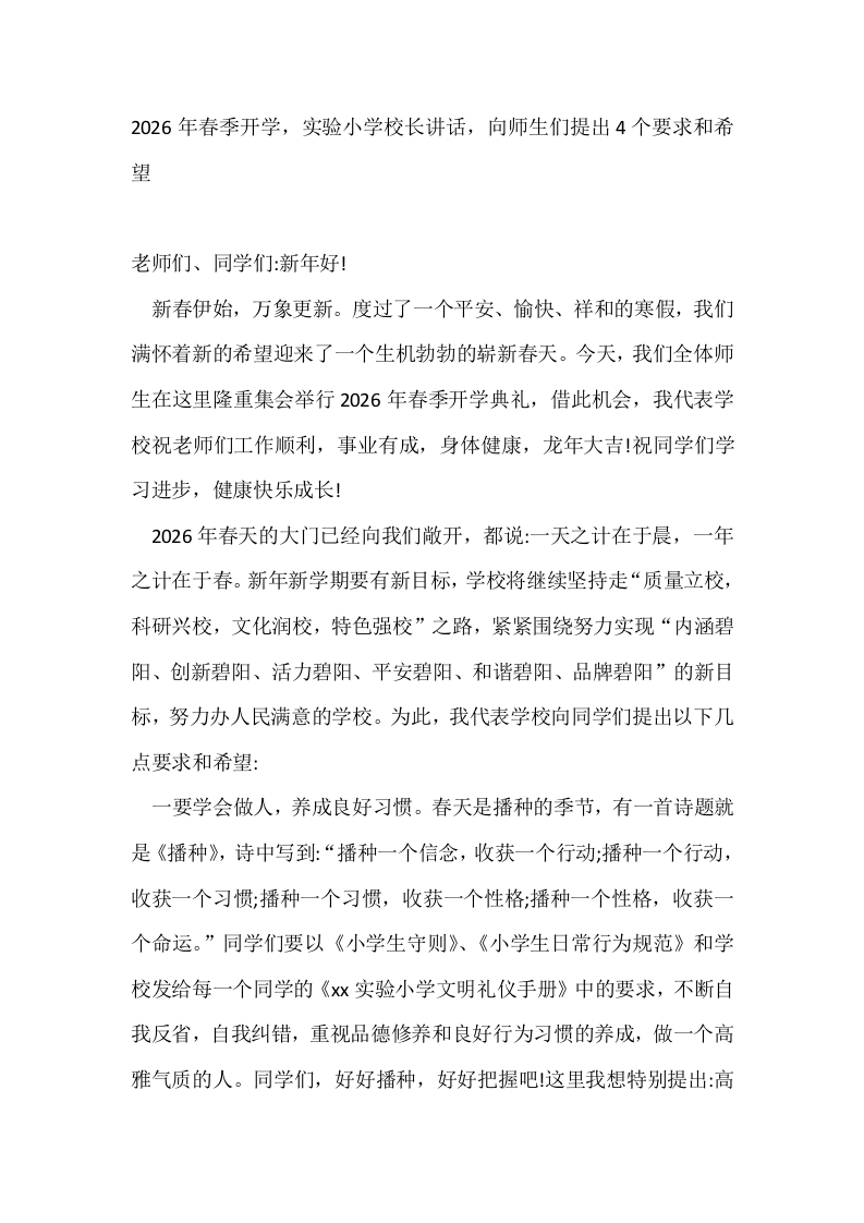 2026年春季开学,实验小学校长讲话,向师生们提出4个要求和希望