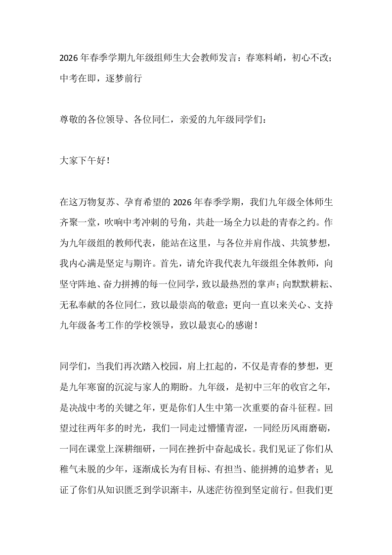 首页教师资料教学常用2026年春季学期九年级组师生大会教师发言:春寒料峭,初心不改;中考在即,逐梦前行