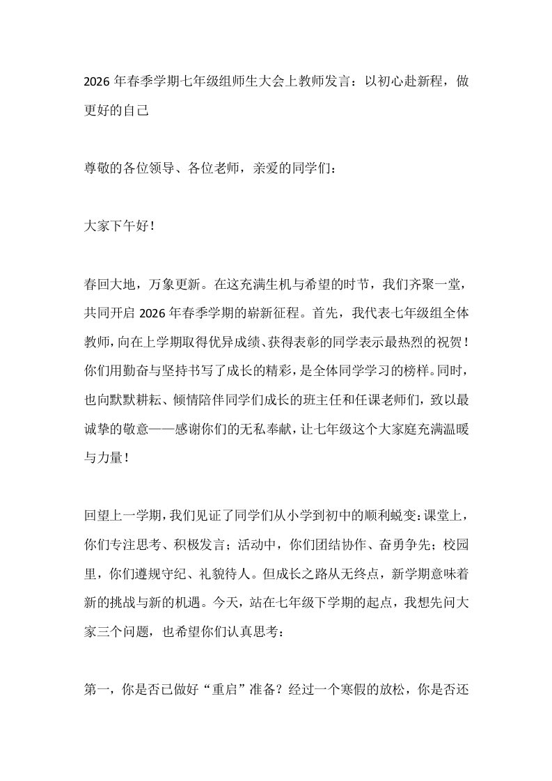 首页教师资料教学常用2026年春季学期七年级组师生大会上教师发言:以初心赴新程,做更好的自己