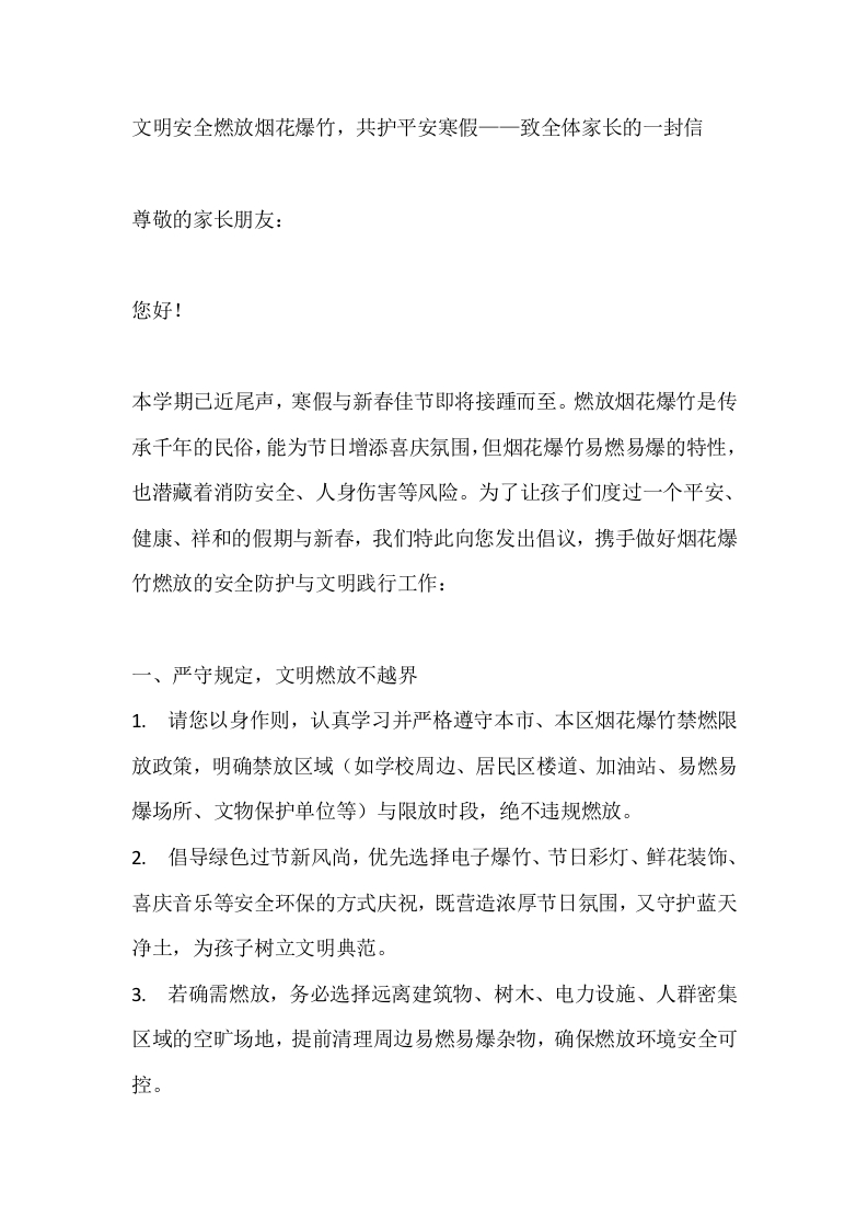 文明安全燃放烟花爆竹,共护平安寒假——致全体家长的一封信
