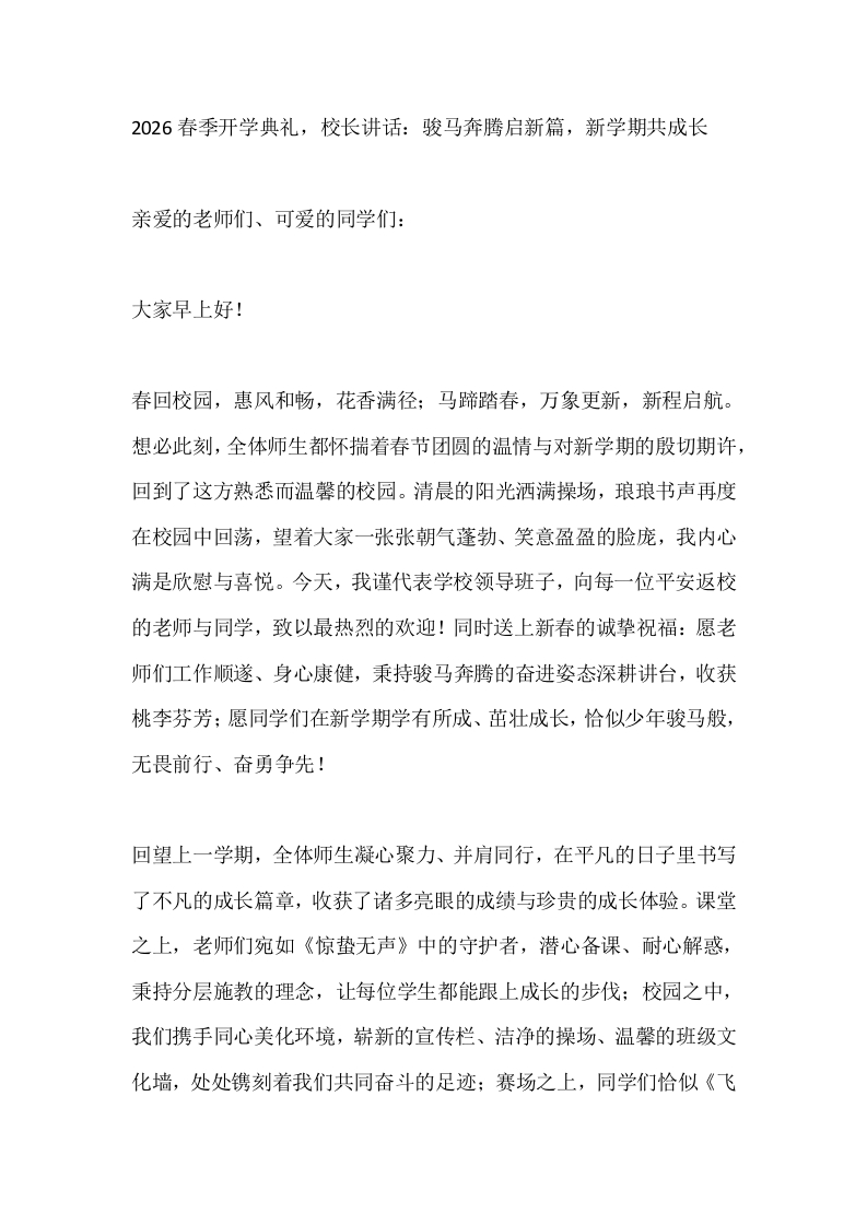 首页校长资料工作讲话2026春季开学典礼,校长讲话:骏马奔腾启新篇,新学期共成长