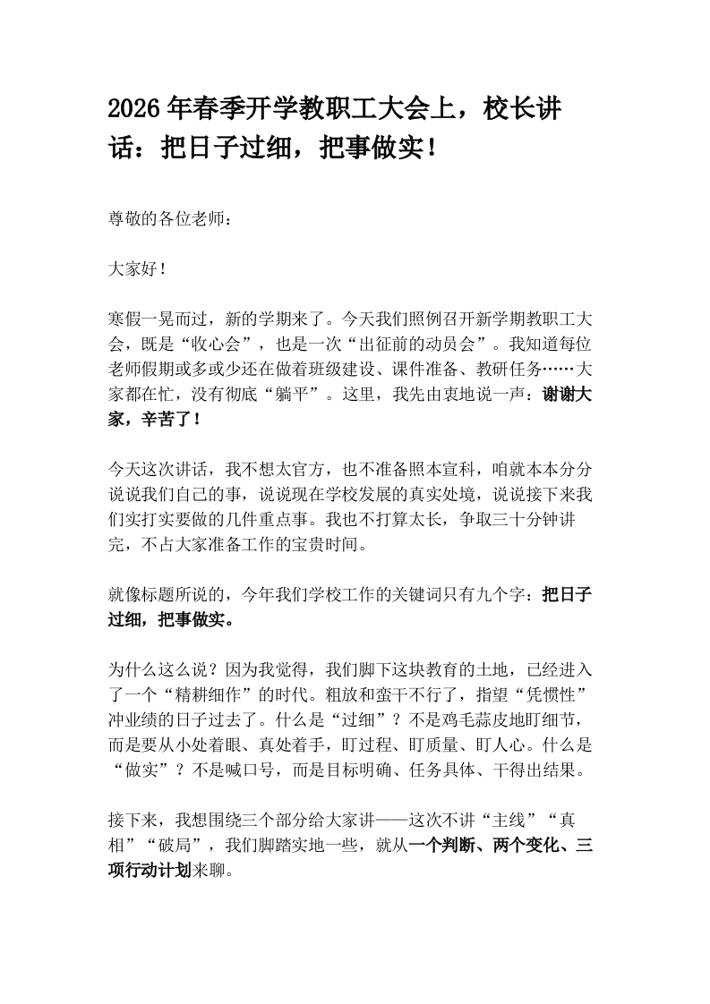 2026年春季开学教职工大会上,校长讲话:把日子过细,把事做实!