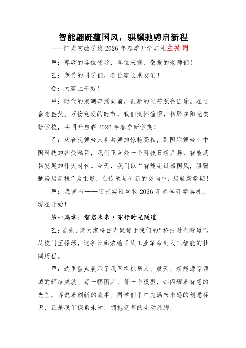 2026年春季开学典礼主持词:智能翩跹蕴国风,骐骥驰骋启新程