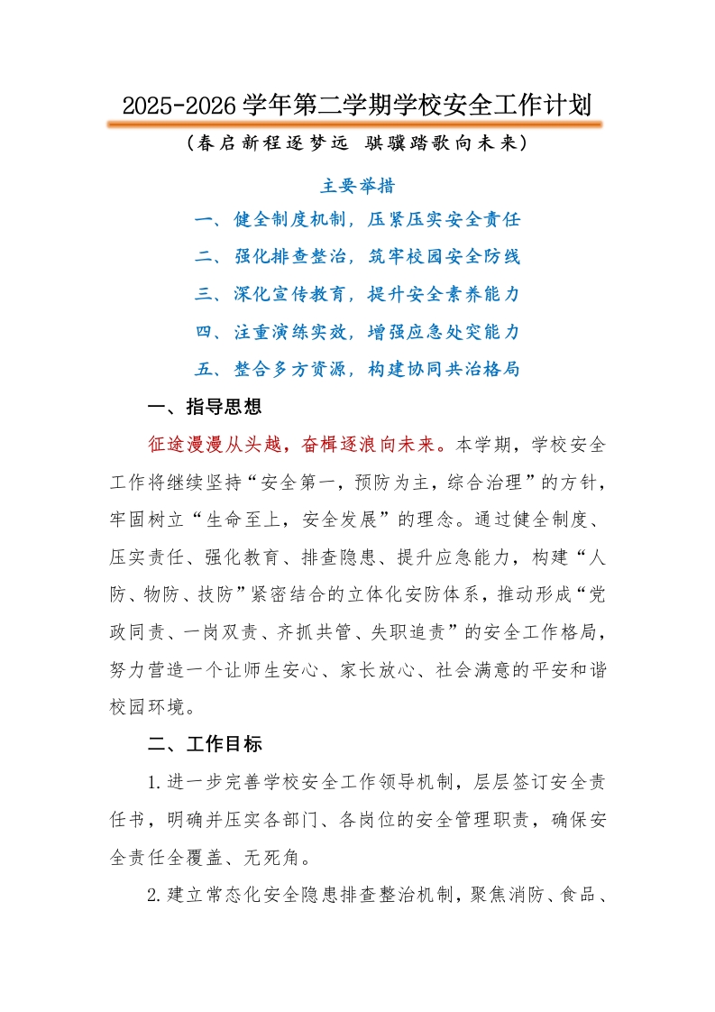 2026年春季第二学期学校安全工作计划:春启新程逐梦远,骐骥踏歌向未来