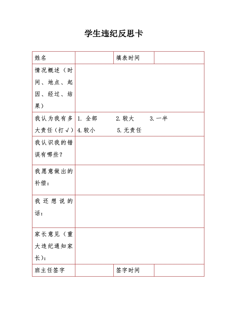 2026年春季 学生违纪反思卡