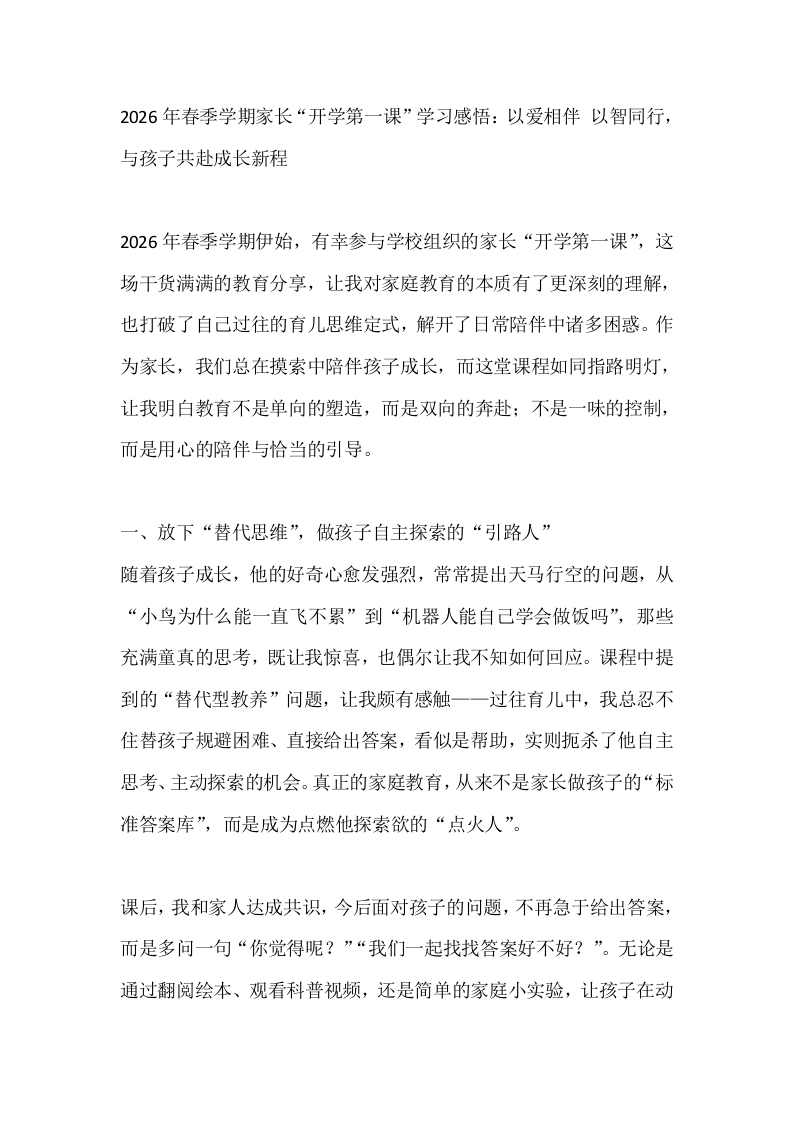 首页班主任库班会文档2026年春季学期家长“开学第一课”学习感悟:以爱相伴 以智同行,与孩子共赴成长新程