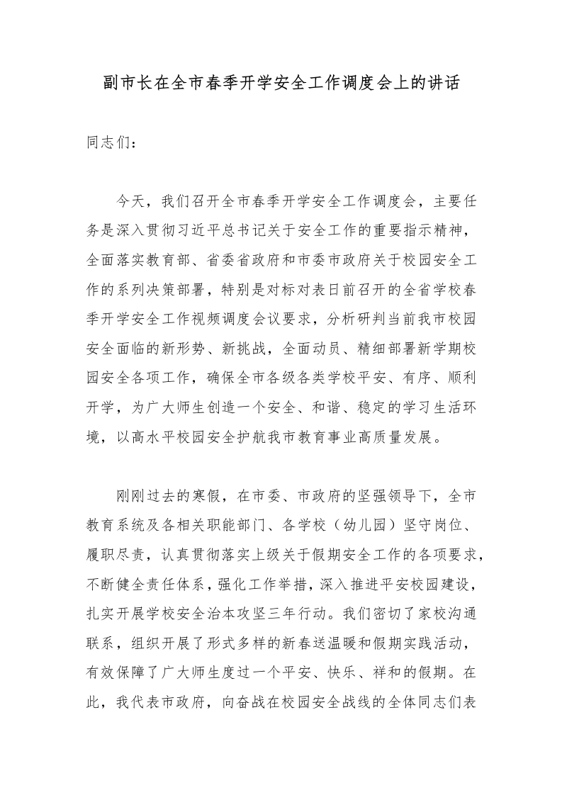 副市长在全市春季开学安全工作调度会上的讲话2