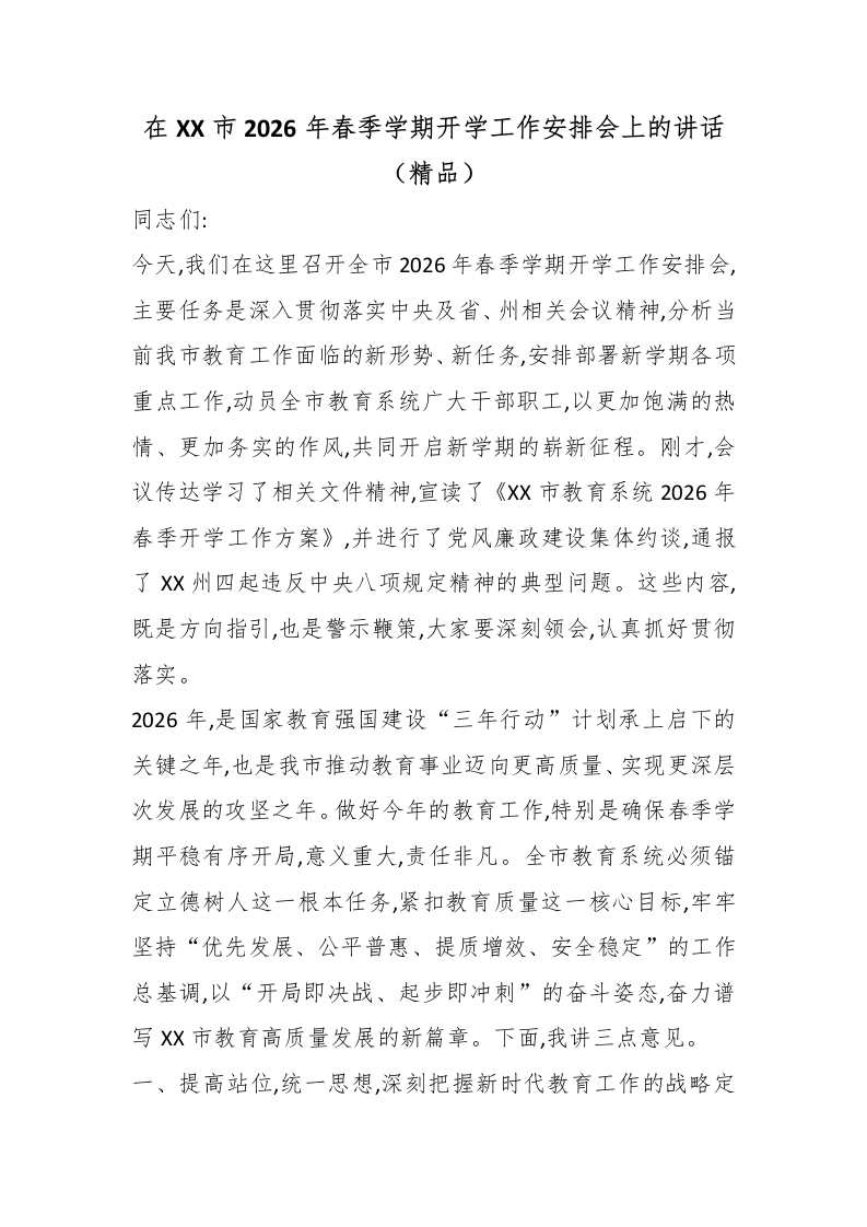 在XX市2026年春季学期开学工作安排会上的讲话(精品)