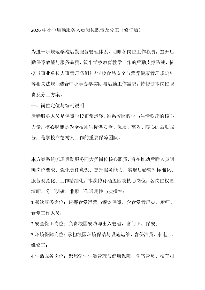 2026中小学后勤服务人员岗位职责及分工(修订版)