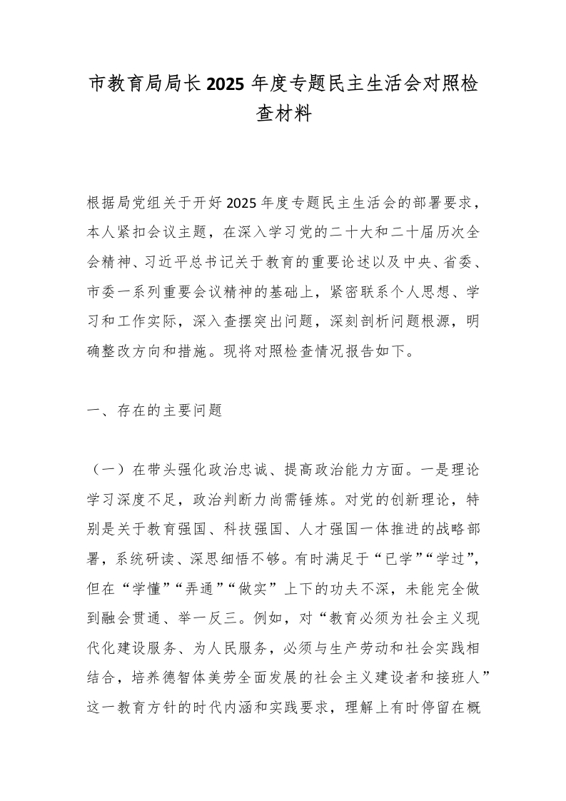 首页党建资料党课党建市教育局局长2025年度专题民主生活会对照检查材料