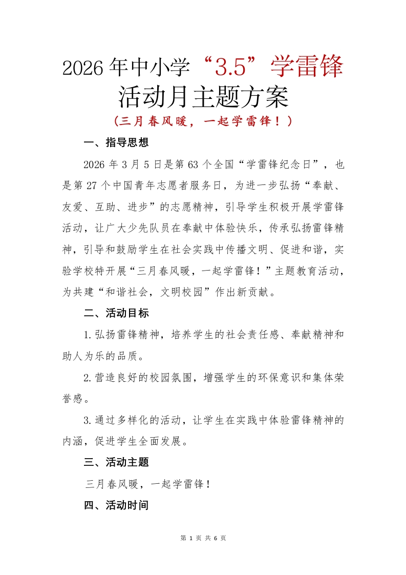 首页热门资源学校活动2026年中小学“3.5”学雷锋活动月活动方案:三月春风暖,一起学雷锋!