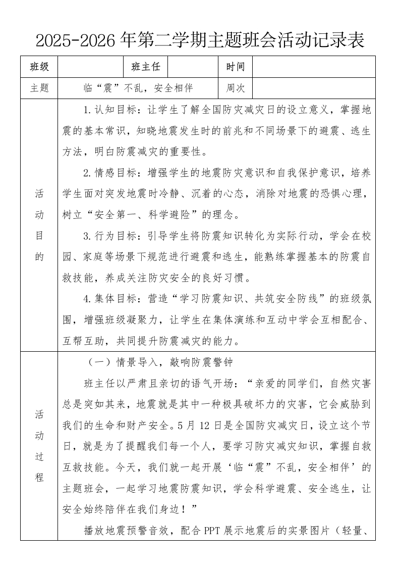 《临“震”不乱,安全相伴》2026年春季第二学期主题班会教案(表格版)