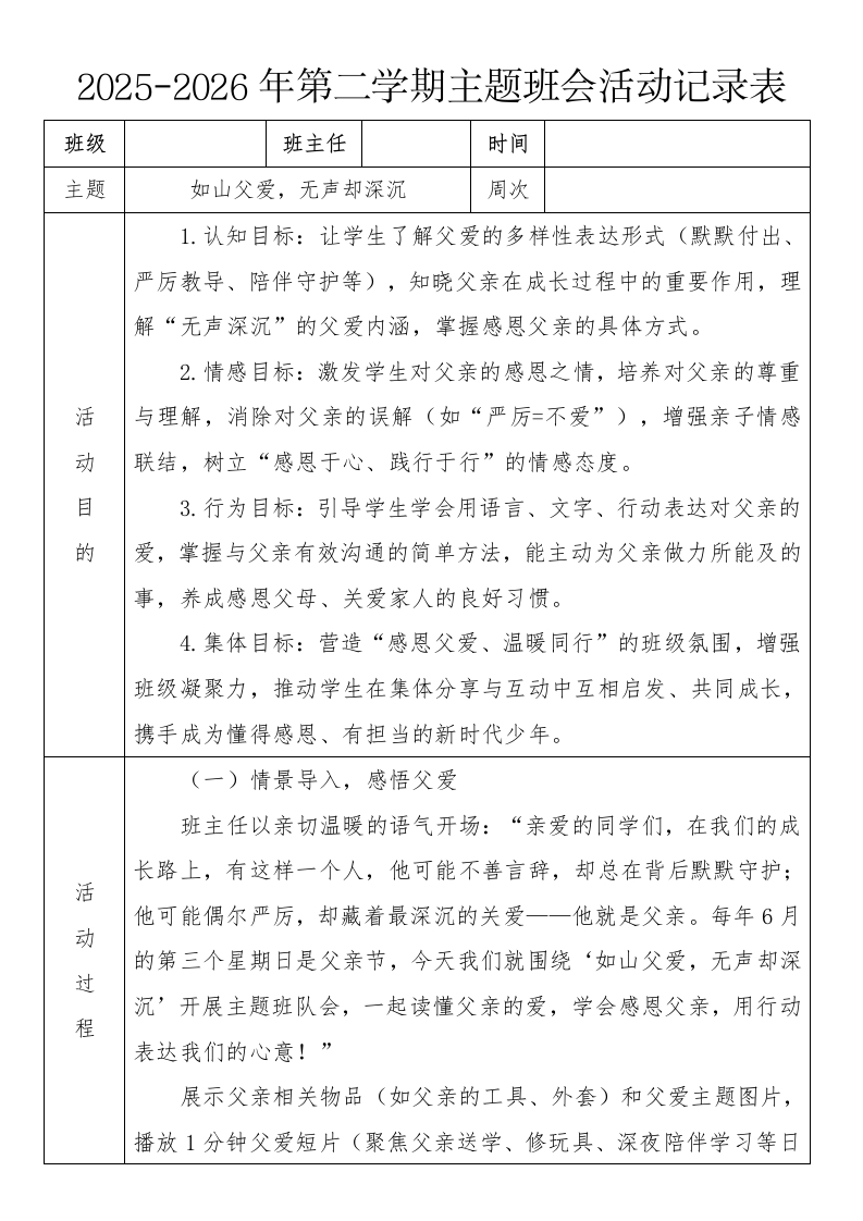 《如山父爱,无声却深沉》2026年春季第二学期主题班会教案(表格版)