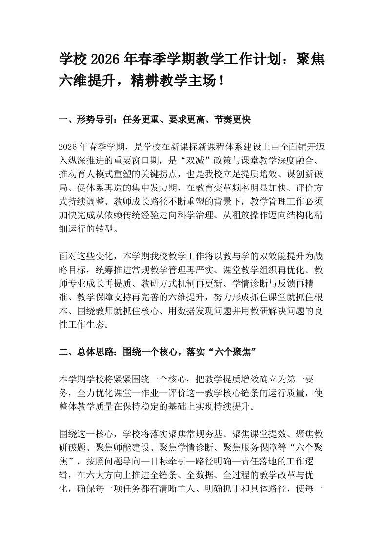 学校2026年春季学期教学工作计划:聚焦六维提升,精耕教学主场!