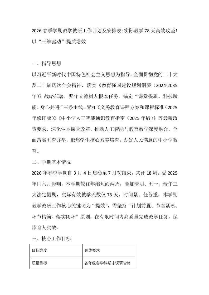 2026春季学期教学教研工作计划及安排表:实际教学78天高效攻坚!以“三维驱动”提质增效