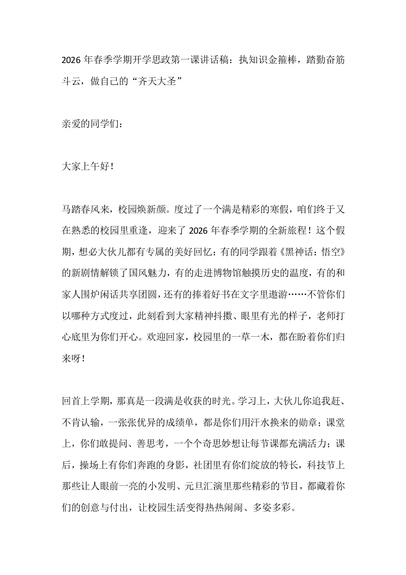 2026年春季学期开学思政第一课讲话稿:执知识金箍棒,踏勤奋筋斗云,做自己的“齐天大圣”