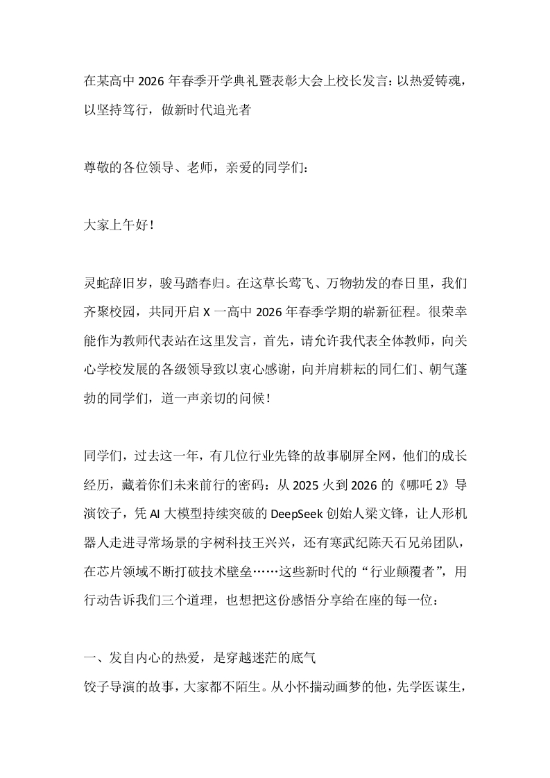 在某高中2026年春季开学典礼暨表彰大会上校长发言:以热爱铸魂,以坚持笃行,做新时代追光者