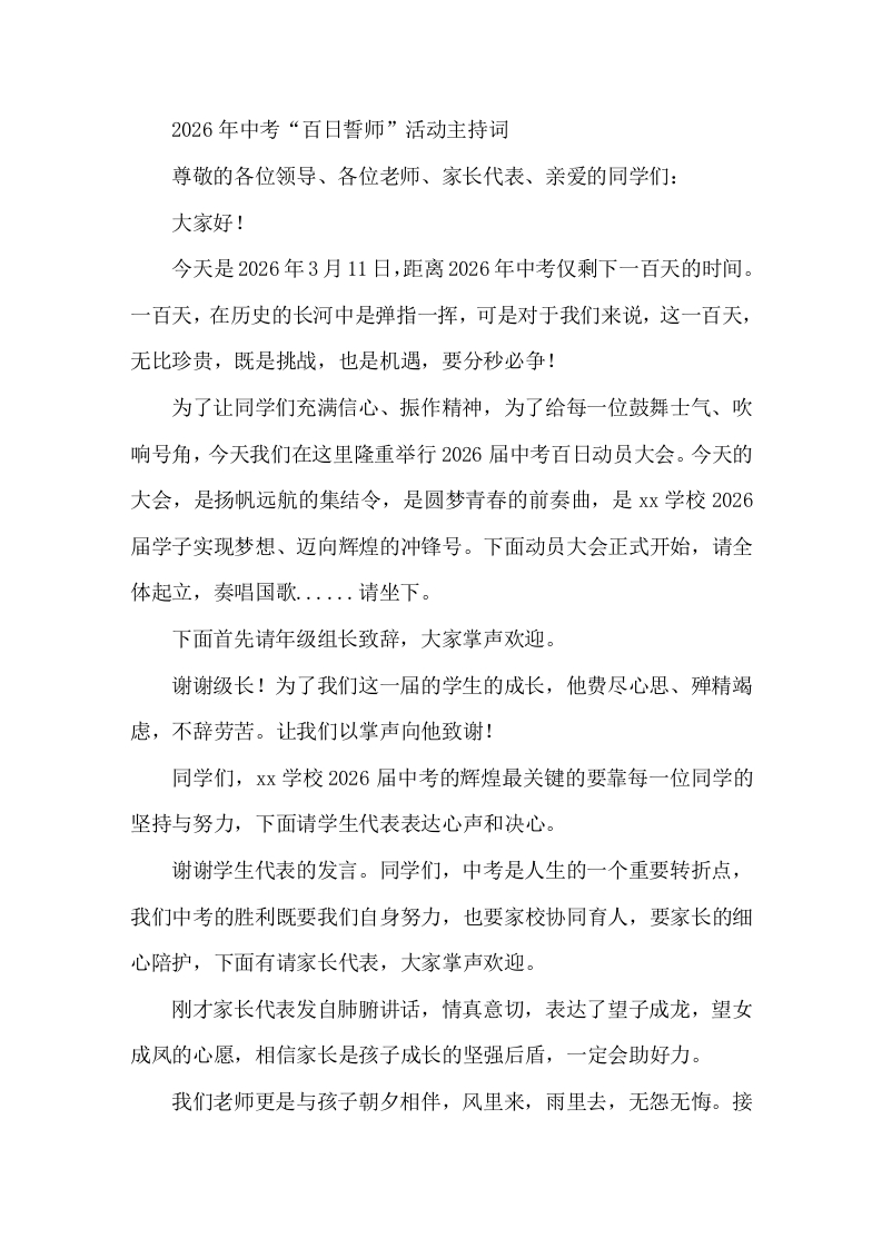 2026年中考 百日誓师 活动主持词让黎明的曙光和夜间的灯火见证我们青春无悔的拼搏