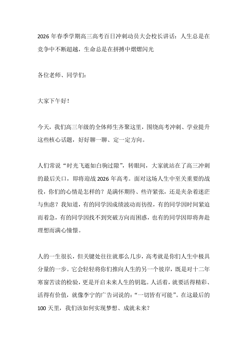 2026年春季学期高三高考百日冲刺动员大会校长讲话:人生总是在竞争中不断超越,生命总是在拼搏中熠熠闪光