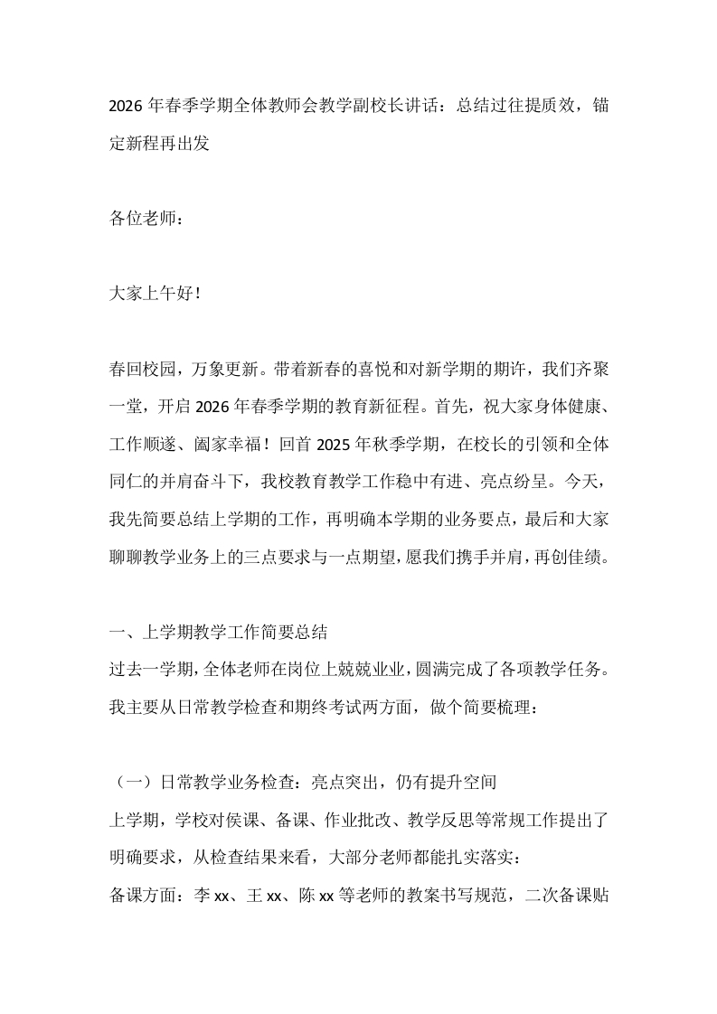 2026年春季学期全体教师会教学副校长讲话:总结过往提质效,锚定新程再出发