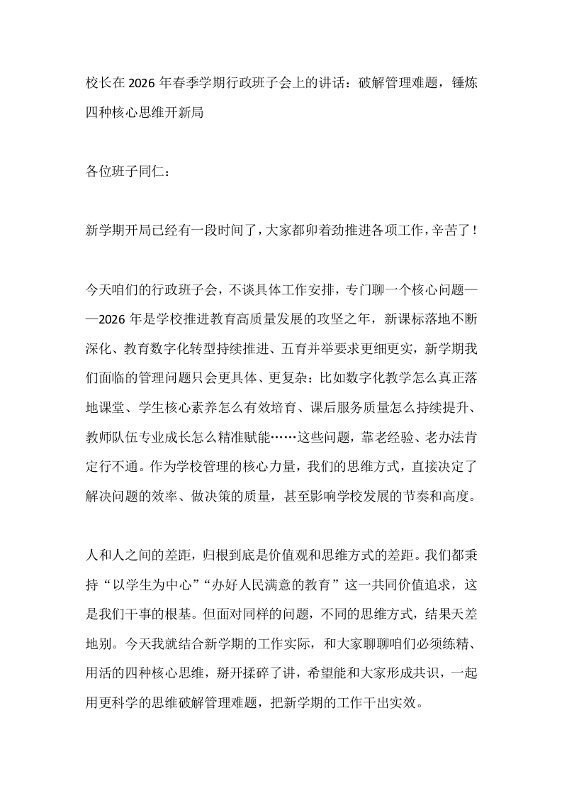 首页校长资料工作讲话校长在2026年春季学期行政班子会上的讲话:破解管理难题,锤炼四种核心思维开新局