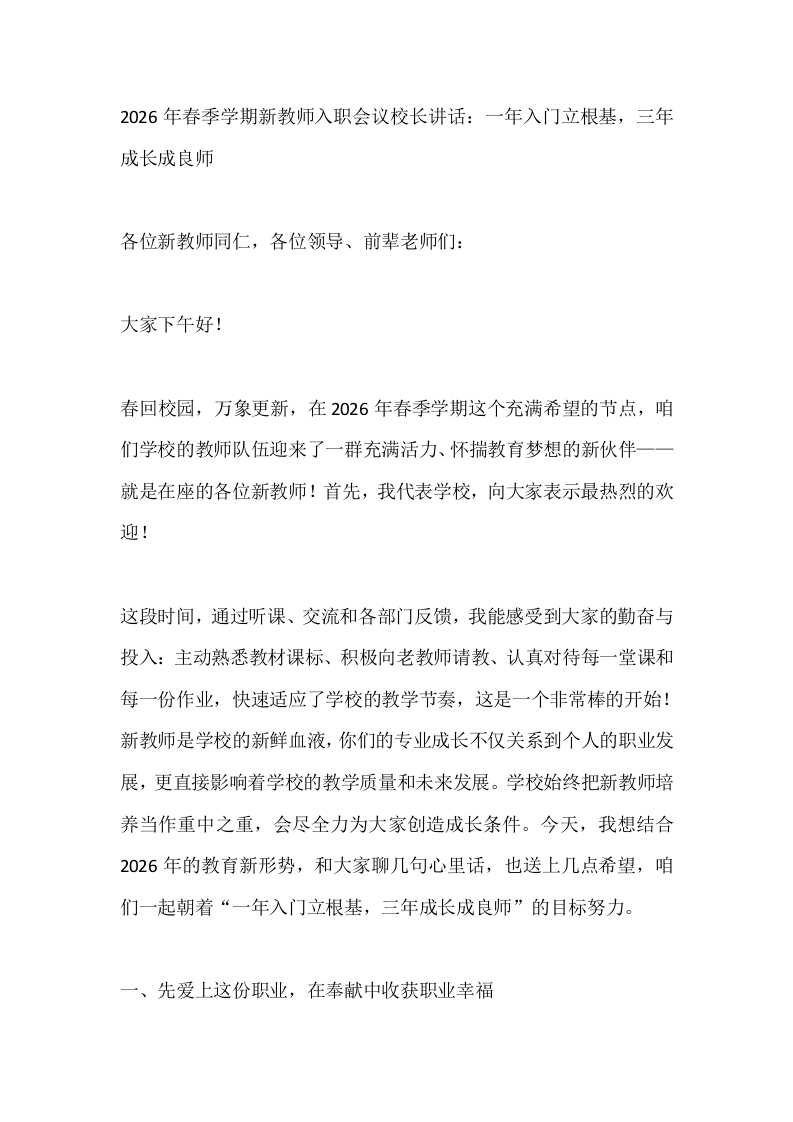 首页校长资料工作讲话2026年春季学期新教师入职会议校长讲话:一年入门立根基,三年成长成良师