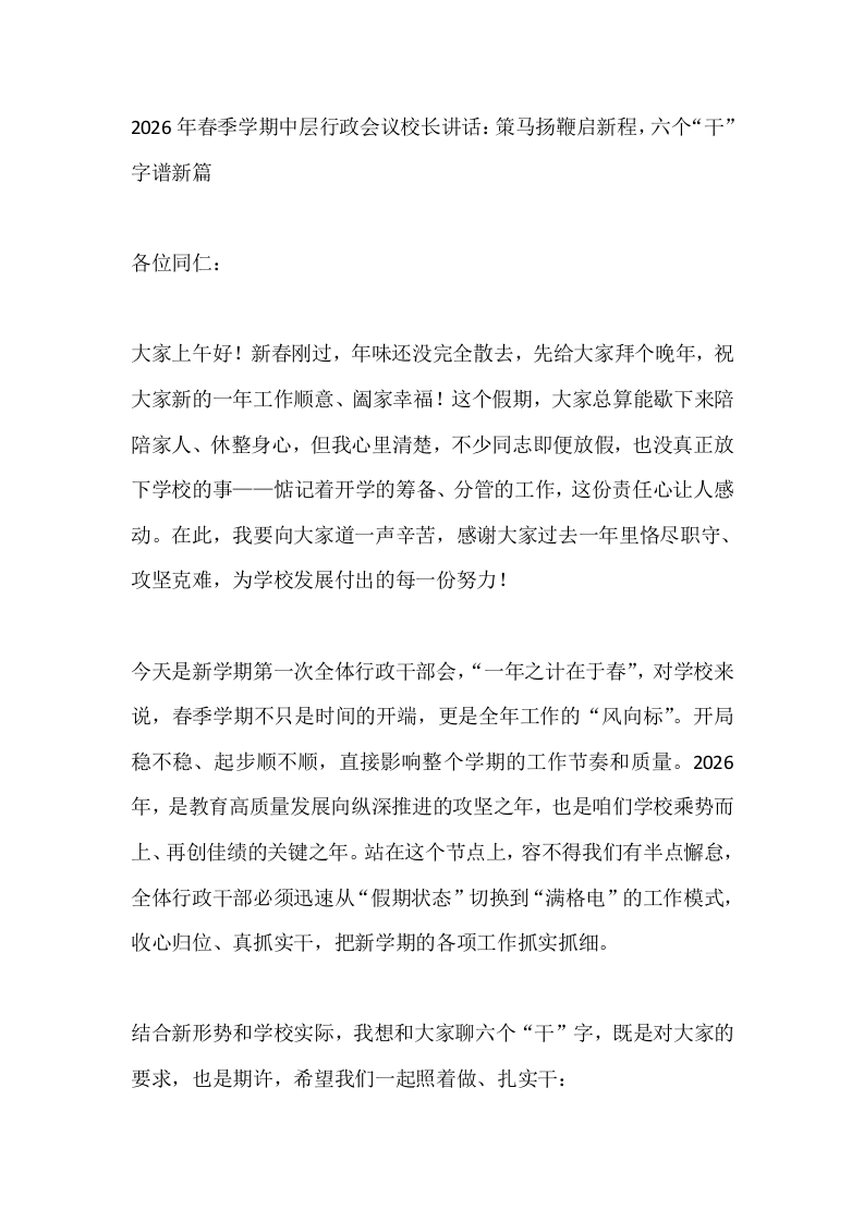 2026年春季学期中层行政会议校长讲话:策马扬鞭启新程,六个“干”字谱新篇