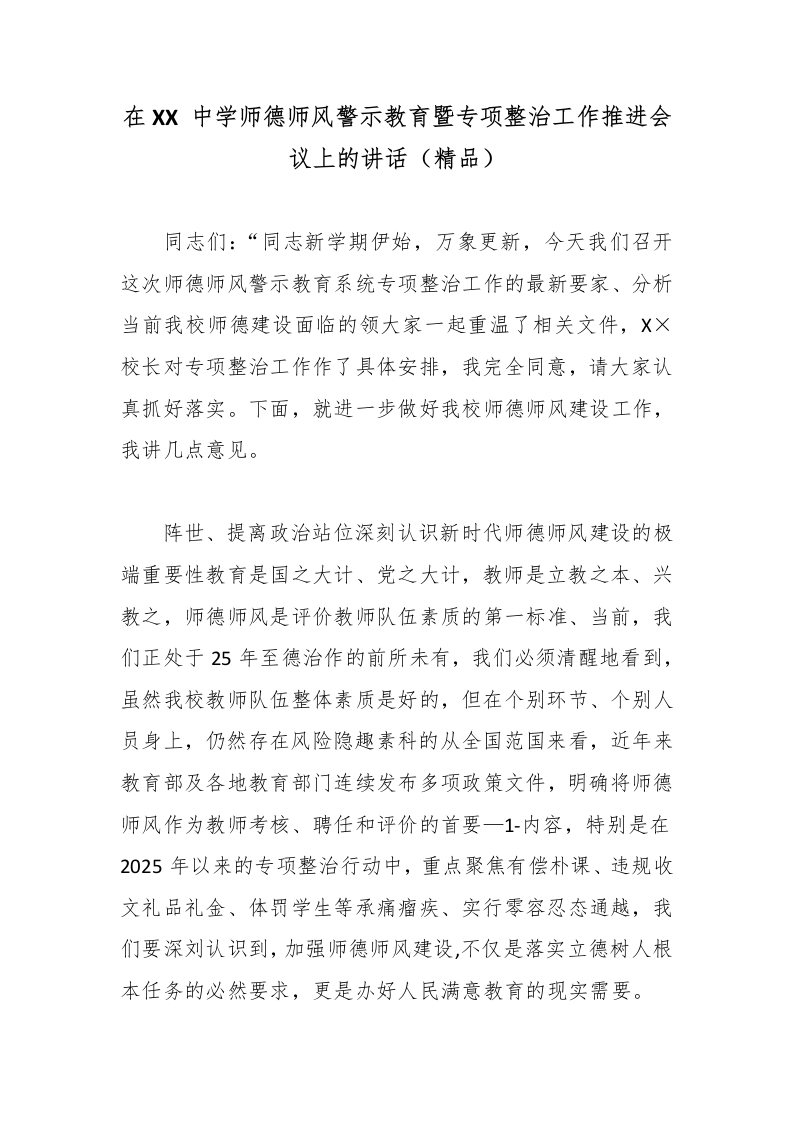 在XX 中学师德师风警示教育暨专项整治工作推进会议上的讲话(精品)