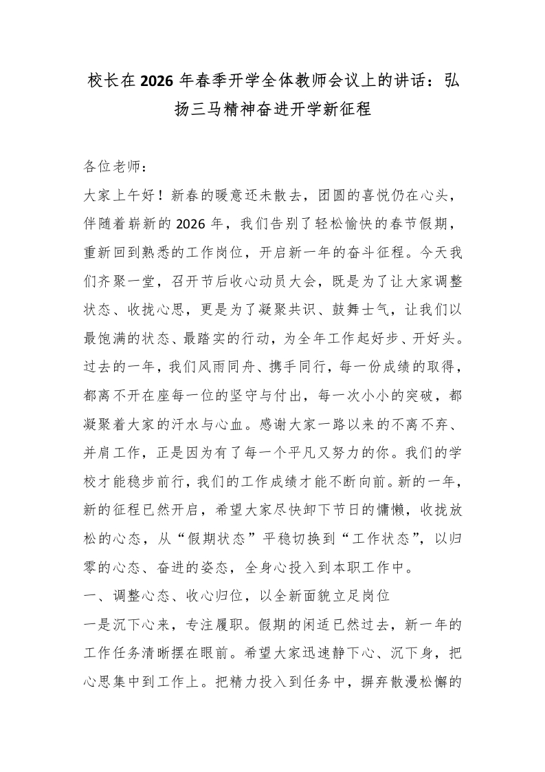 校长在2026年春季开学全体教师会议上的讲话:弘扬三马精神奋进开学新征程