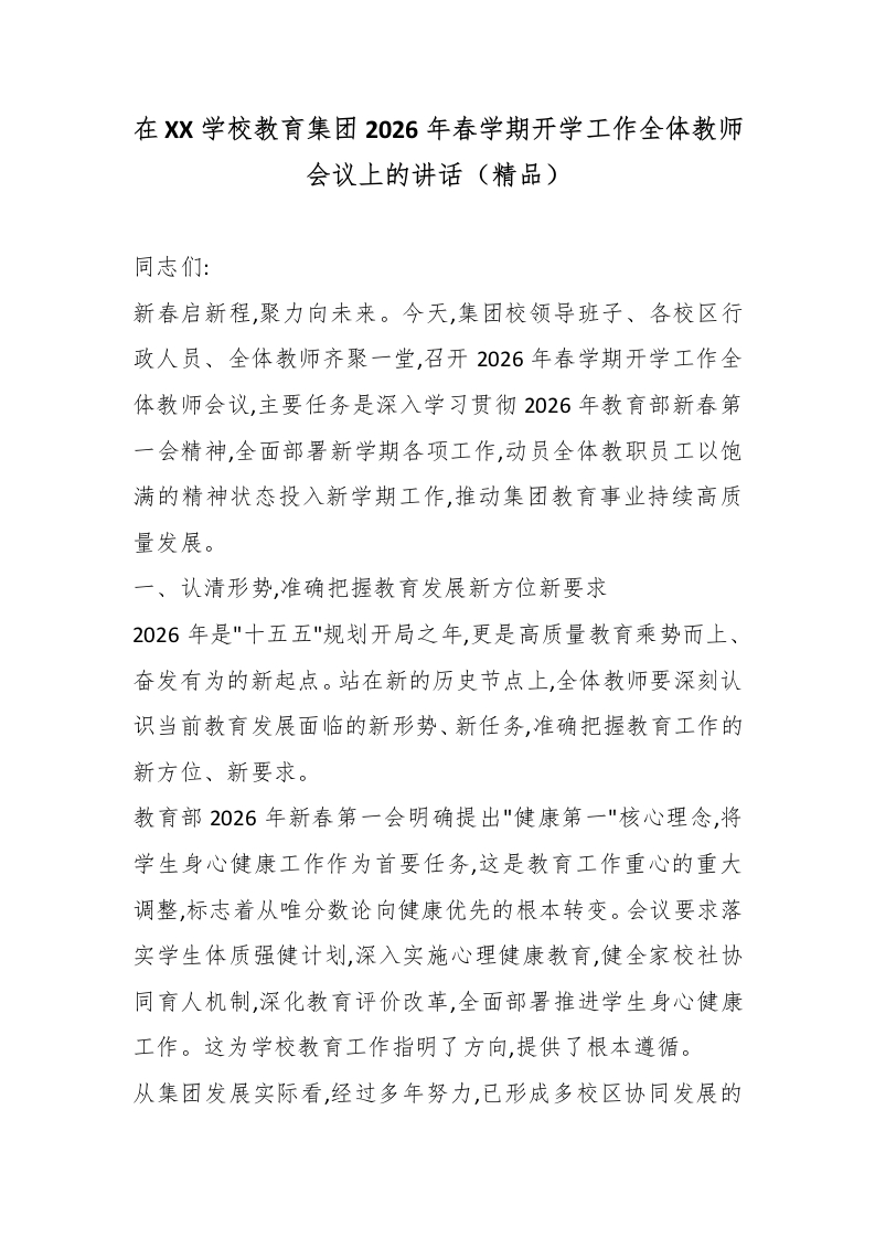 在XX学校教育集团2026年春学期开学工作全体教师会议上的讲话(精品)