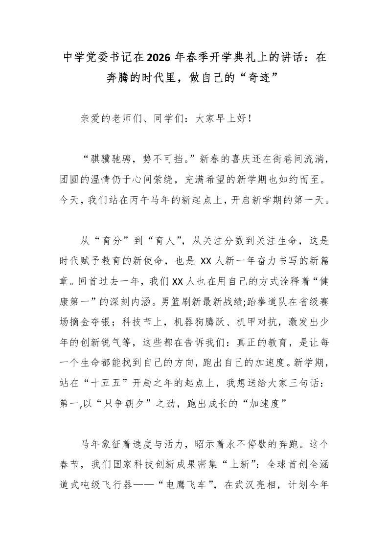 首页校长资料活动讲话中学党委书记在2026年春季开学典礼上的讲话:在奔腾的时代里,做自己的“奇迹”