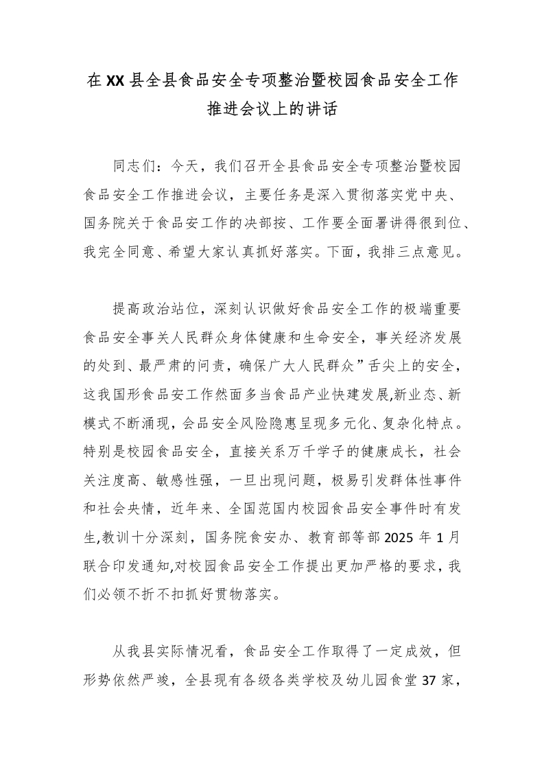 在XX县全县食品安全专项整治暨校园食品安全工作推进会议上的讲话