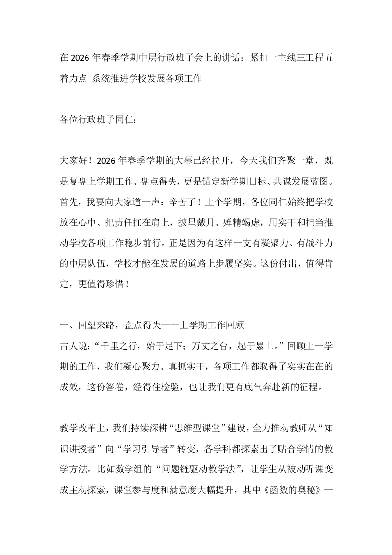 首页校长资料工作讲话在2026年春季学期中层行政班子会上的讲话:紧扣一主线三工程五着力点 系统推进学校发展各项工作